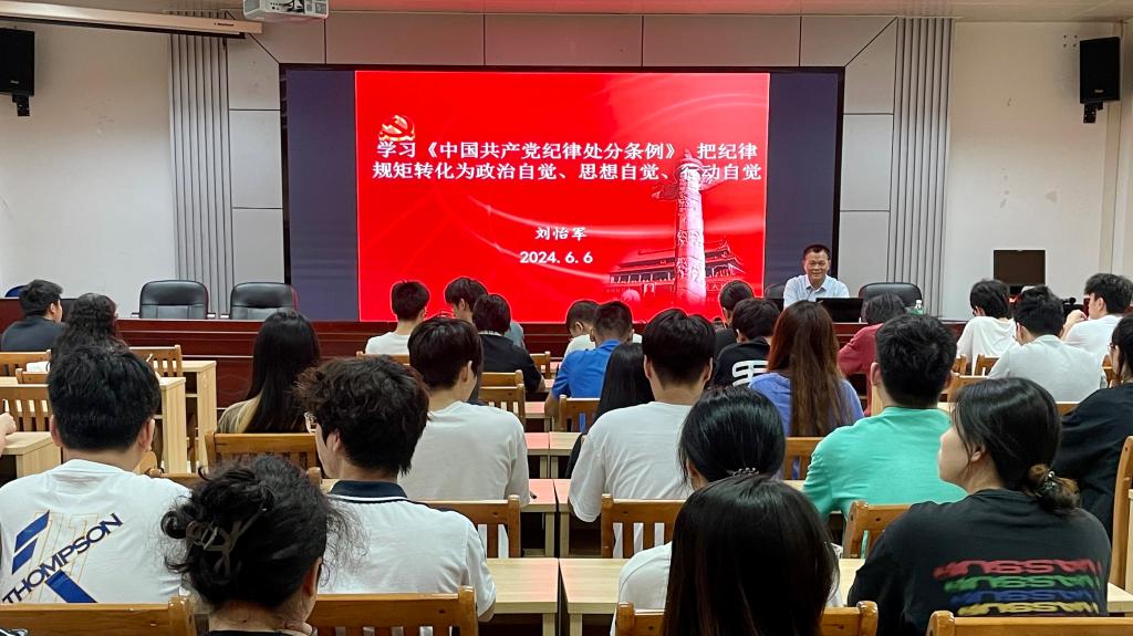 6月6日,广东工业大学帮扶队长刘怡军为资产设备管理部党支部、帮扶队党支部、电子与电气工程学院电气工程及其自动化专业党支部及计算机科学与软件学院计算机科学与技术系教师党支部党员、发展对象及入党积极分子讲授《学习中国共产党纪律处分条例——把纪律规矩转化为政治自觉、思想自觉、行动自觉》的专题党课。